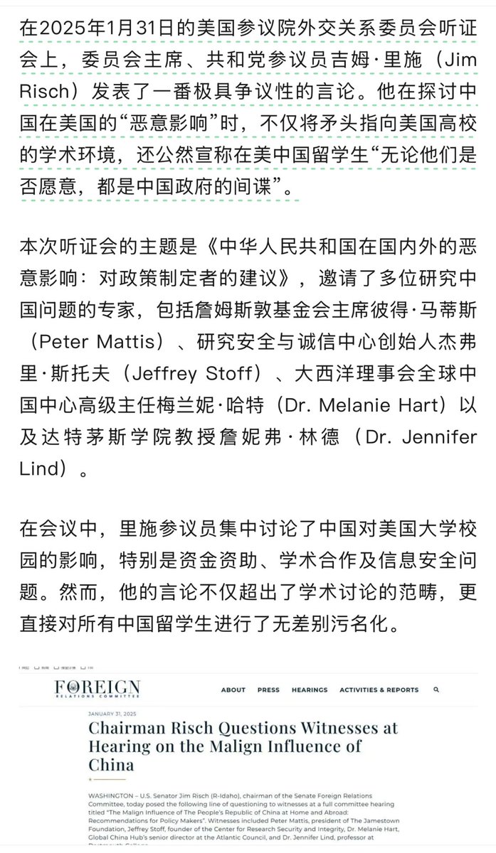 美国参议院外交委员会主席,爱达荷州共和党参议员Jim Risch:在美国的中国留学生,他们每个人,无论是否愿意,都是中国政府的间谍。
