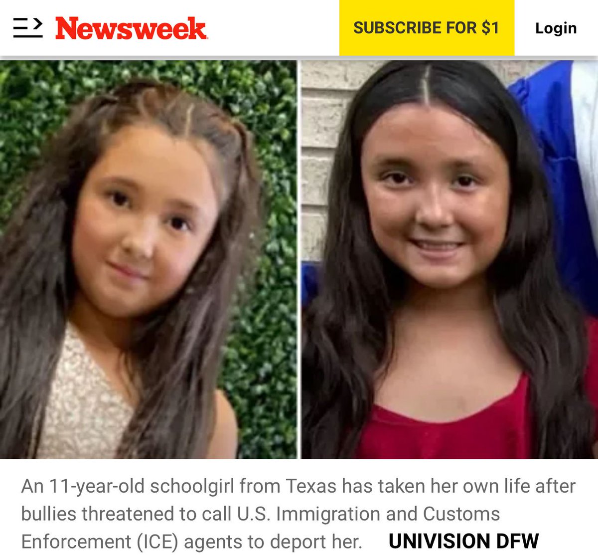 11岁的小女孩结束了自己的生命因为在学校里遭受霸凌,同学威胁要打电话给移民局,把她的父母抓走留下她一个人。这样的事情肯定还会不断发生,因为无证移民在美国出生的孩子有440万。我真讨厌那些为此叫好的人!以下是捐款链接( 捐款开始时,孩子还在医院抢救)