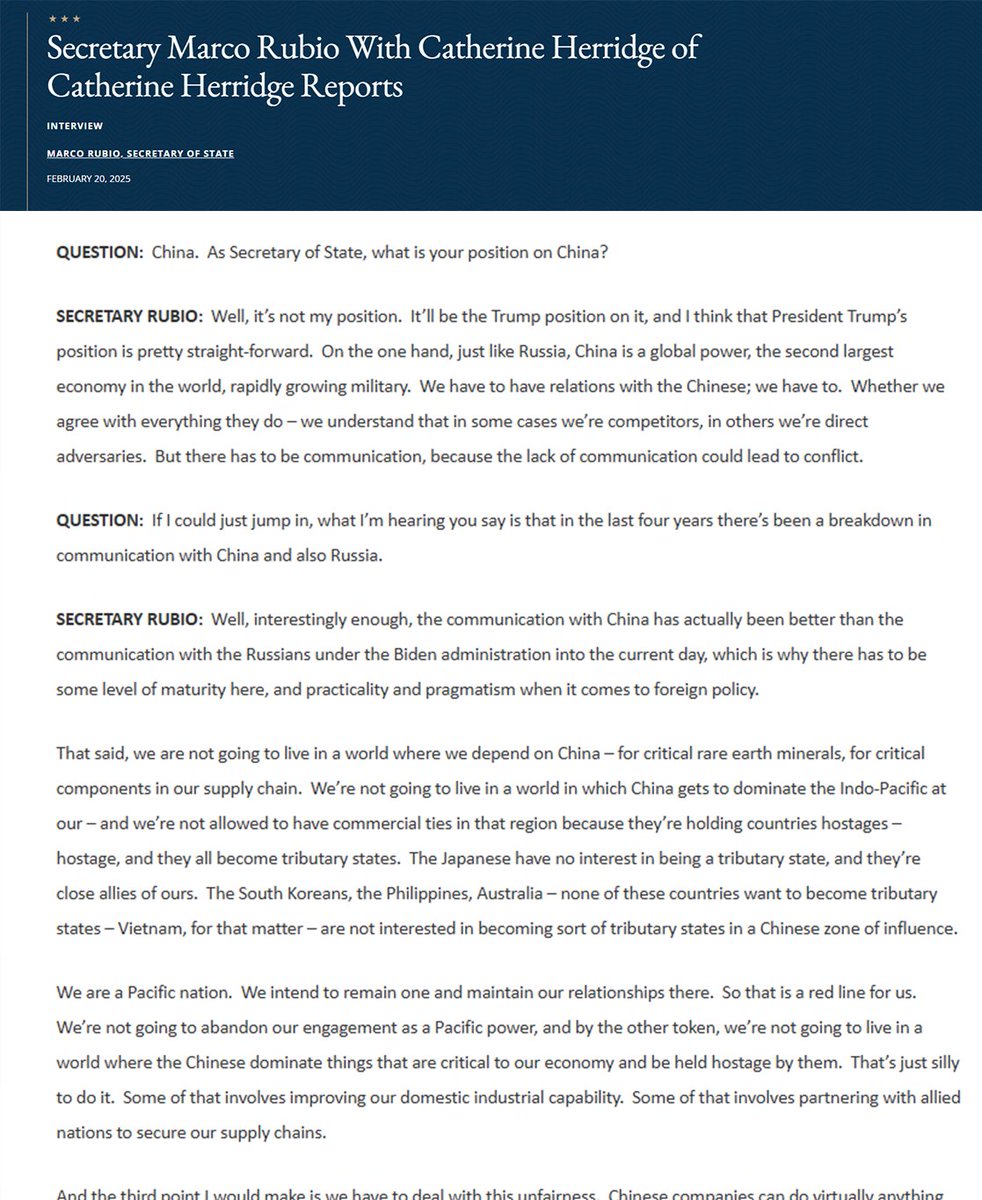 2月20日,美国务卿卢比奥表示,中国是是世界第二大经济体,华盛顿必须与北京建立关系。