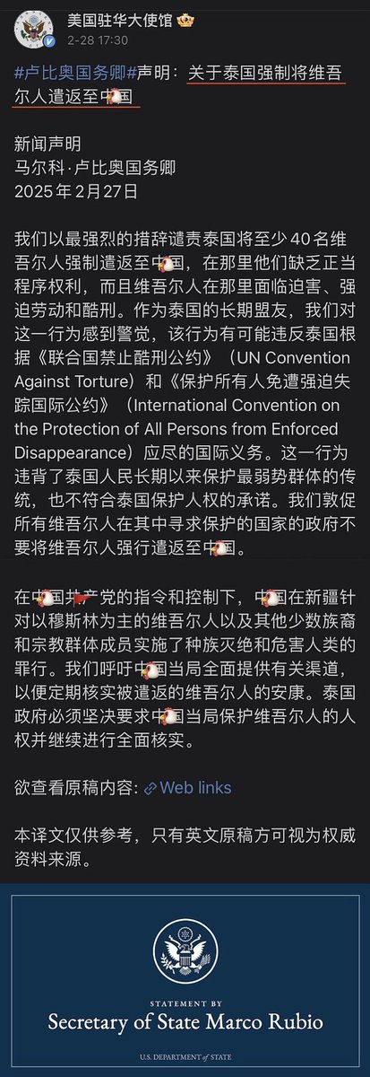 40名已在泰国被拘近11年的中国籍维吾尔族人,星期四被遣返新疆喀什。美国国务卿卢比奥同日发声明,以最强烈的措辞谴责泰国强迫至少40名维吾尔人返回中国,指他们在中国缺乏正当程序权利,并指维族人在中国遭受迫害、强迫劳动和酷刑。 28日美国驻华大使馆也在官方微博上发布了这则声明,目前已被删除。
