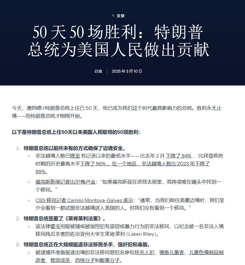 3月10日,白宫官网:“50天50场胜利:特朗普总统为美国人民做出的贡献” 3月9日:“美国的黄金时代已经到来” 3月8日:“在特朗普总统的领导下,我们永远不会厌倦胜利”