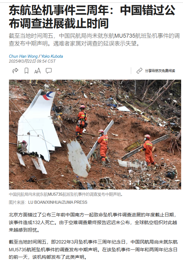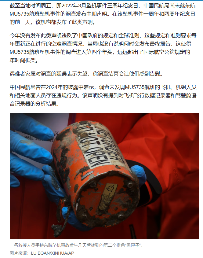 WSJ:东航MU5735航班坠机事件三周年,中国民航局未按中国政府的规定和全球准则发布中期声明。在该坠机事件一周年和两周年纪念日的前一天,该机构都发布了此类声明。遇难者家属对调查的延误表示失望,称调查结束会让他们感到告慰。 有国际航空运输协会成员表示,不少事故是被政府从政治层面搁置了,因为不希望这些叙述引起公众的关注。 《华尔街日报》曾报道黑匣子数据指向有人蓄意操纵飞机坠毁,但中国民航局表示传言「严重误导」。