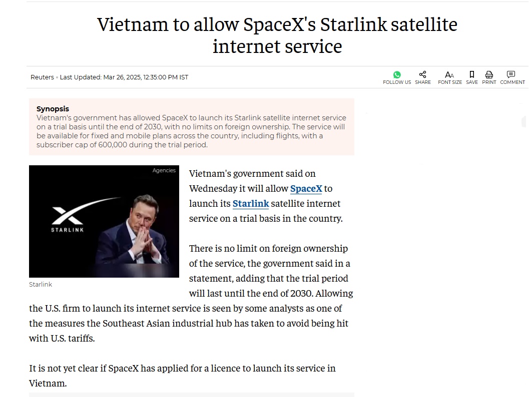 越南政府星期三宣布,允许星链公司(Starlink)在越南试行提供卫星互联网服务,并允许星链完全持有在当地子公司的所有权。这项试行服务将持续到2030年底。 越南政府在一份声明中说,星链获准在越南全国提供固定和移动服务计划,包括在航班上提供服务。政府决定在试行期内,将星链用户数量限制在60万。 分析人士认为,这是越南为避免遭受美国关税政策打击而采取的措施之一。