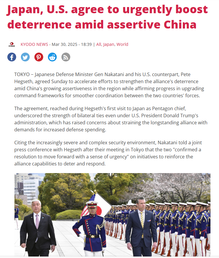 美日防长会谈:加快提高对中国威慑能力。当地时间3月30日,美国国防部长赫格塞斯在访问日本时对日本防卫大臣中谷元说,“我们拥有共同的武士精神,这定义了我们的军队” 日本是“印太地区和平与安全的基石”。赫格塞斯还说,“日本是我们吓阻共产中国军事侵略不可或缺的伙伴”,其中包括对台湾海峡的侵略。