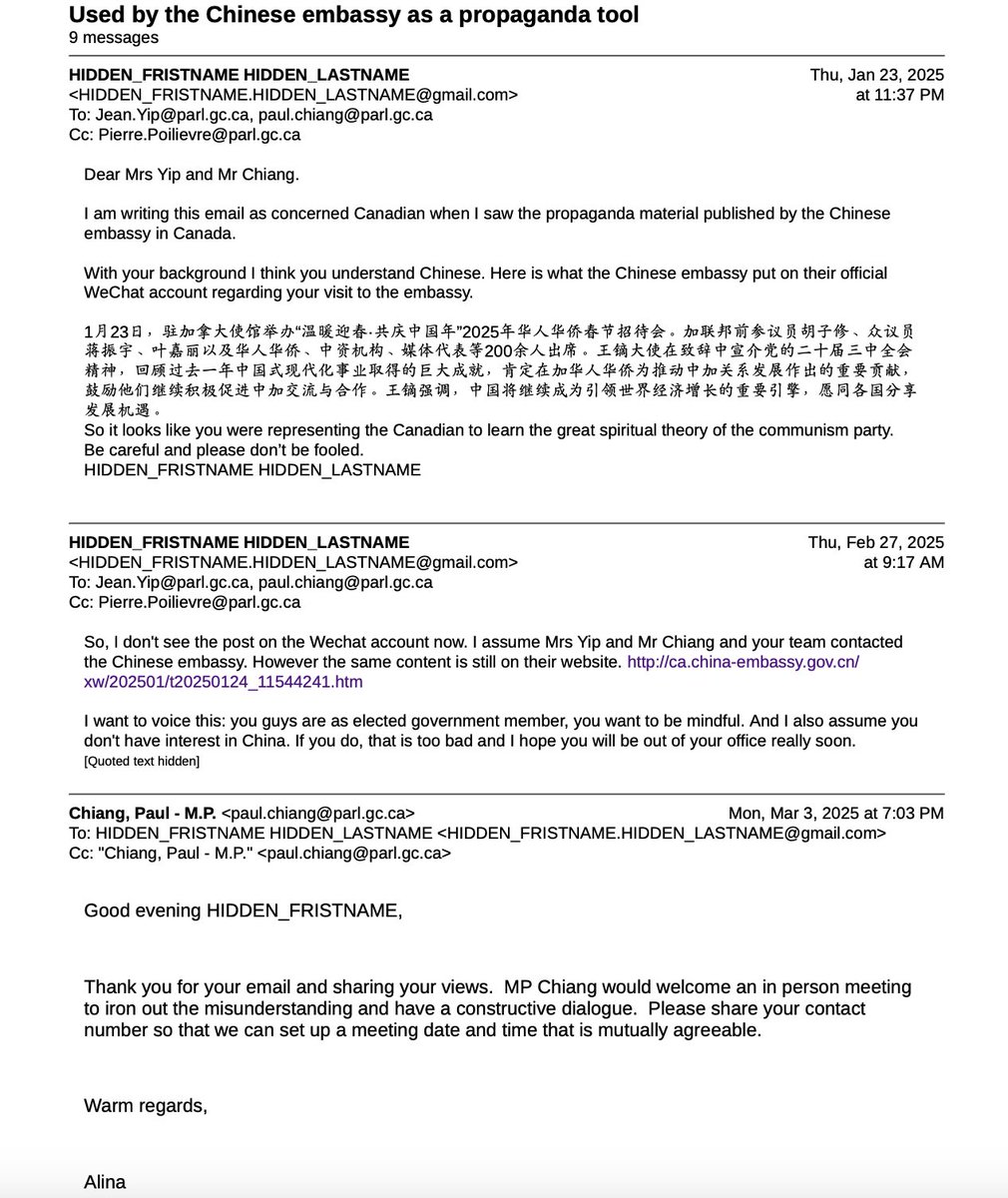 Leaked: Liberal MP Paul Chiang’s secret email exchange with a constituent who questioned his affiliation with China over a controversial WeChat post. The post, which showed Chiang meeting with the Chinese Consul General, was taken down after the complaint. The post also stated