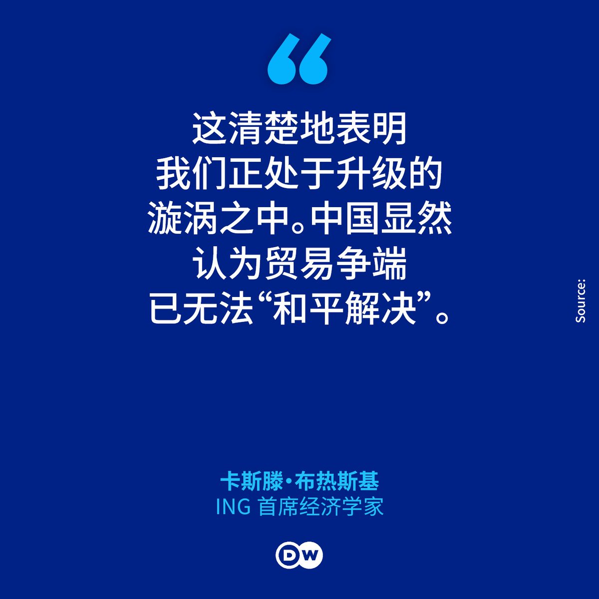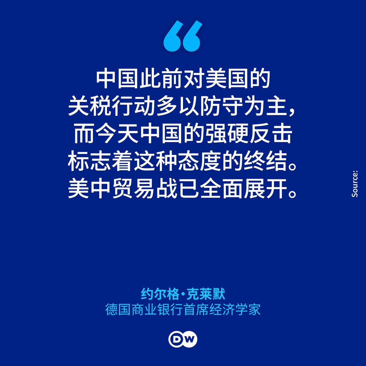 “这清楚地表明我们正处于升级的漩涡之中。中国显然认为贸易争端已无法‘和平解决’。这也增加了其他国家,尤其是欧盟仿效此举、让局势进一步升级的可能性。对德国经济来说,这将意味着通胀压力上升,因为全球范围内价格都在上涨。而德国的出口行业不会从中获益,因为美国对华出口的商品与德国出口商品存在很大差异。”