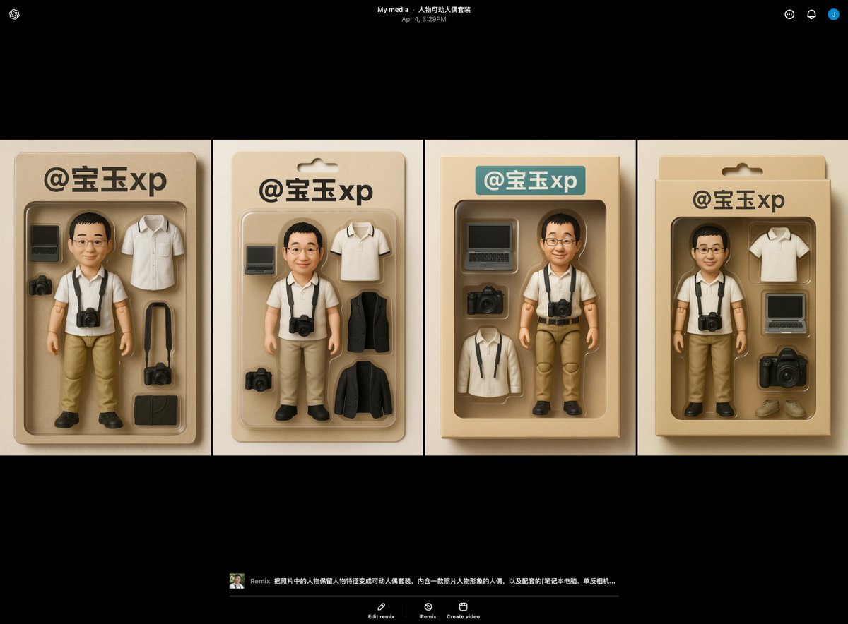 把照片中的人物变成塑料包装的可动人偶套装工具:sora 或者 GPT-4o提示词(需要上传半身或者全身单人照片,使用时请替换提示词关键字):把照片中的人物保留人物特征变成可动人偶套装,内含一款照片人物形象的人偶,以及配套的[笔记本电脑、单反相机和服饰]。包装盒的标题为“