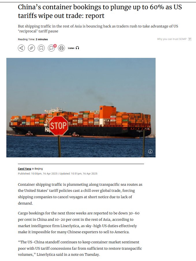 报告称,由于美国关税打击贸易,中国集装箱订单量将暴跌60% 市场情报公司Linerlytica报告,由于美国高额关税使得许多中国出口商无法向美国销售产品,未来三周中国货物预订量将下降30%至60%,亚洲其他地区货物预订量下降10%至20%。 丹麦咨询公司Sea-Intelligence在周日报告中表示,许多跨太平洋航运公司已采取“空白航行”措施,即取消预定的航次。空白航行通常是指取消已排定的船舶班次,这可能包括整个航程被取消,或在计划航线上跳过一个或多个港口的情况。
