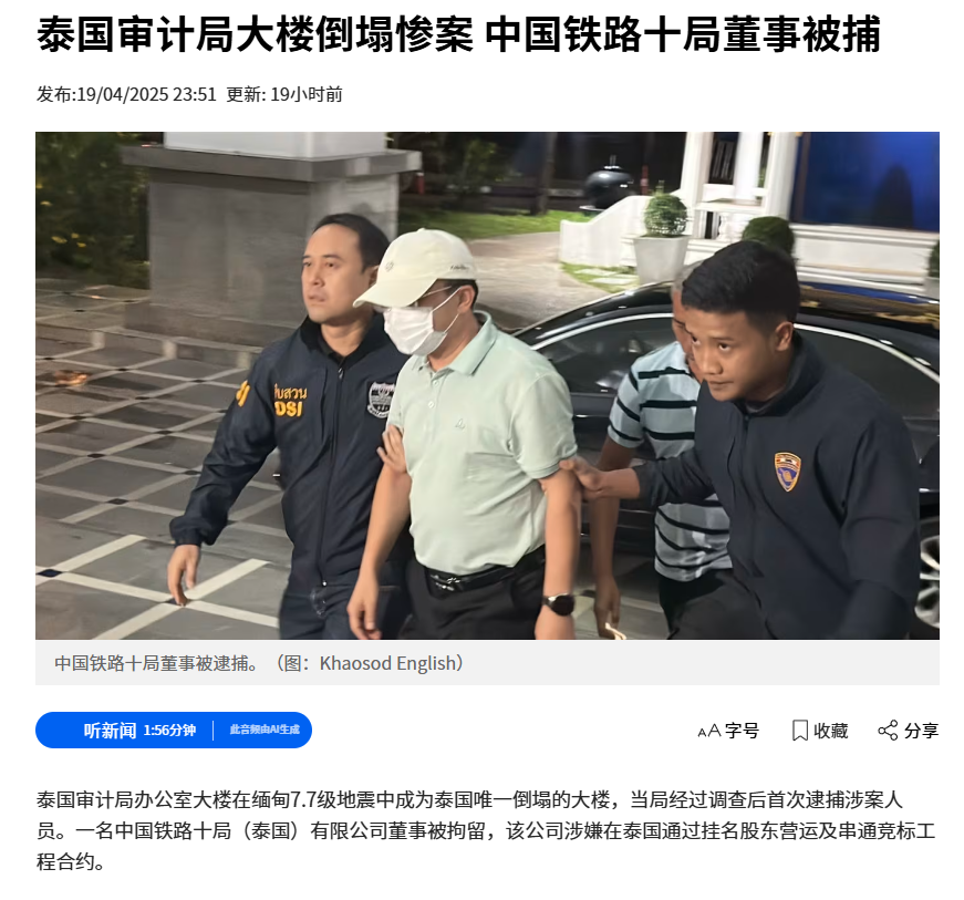 泰国审计局办公室大楼在缅甸地震中成为泰国唯一倒塌的大楼,周六泰国警方在曼谷一家酒店逮捕了中铁十局泰国公司的总经理张传令,该公司涉嫌在泰国通过挂名股东营运及串通竞标工程合约。