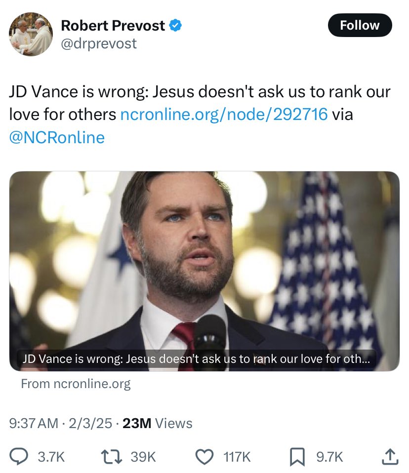 不知道是不是不满特朗普的恶搞,130名红衣主教们选出来的新教皇竟然是个川黑🤣 新产生的教皇Robert Prevost此前在芝加哥担任红衣主教。最近,他转发了推特上批评特朗普驱逐移民的方式非法的推文,并将这则推文置顶(图三)。今年二月份,他批评万斯的上帝的爱有不同的优先级之说(图四),万斯本人就是天主教徒。 ——特朗普、万斯已经成了票房毒药。只等明年的中期选举,给肆意妄为的他们套上枷锁!