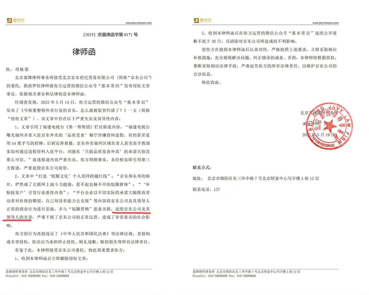 5月19日,项栋梁发文称,收到京东律师函,律师函称“诋毁京东公司及其领导人的名誉”并要求删掉侵权文章。项栋梁在文中对此表示:如果说出了事实就算诋毁京东公司及其领导人的名誉,那这边建议京东好好想想,为什么他们的名誉和事实水火不容。