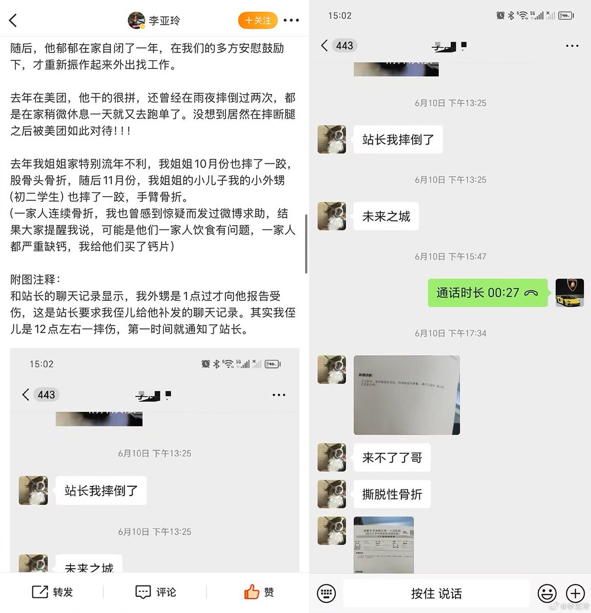 5月20日,四川李女士称,2024年6月10日,外甥跑美团外卖时摔伤骨折,当时他打电话给站长请求转单,但被站长拒绝,并被告知必须要送完手里剩下的单子,就这样,外甥忍着剧痛一瘸一拐送完了最后两单。之后外甥回到站点申请请假就医,站长表示可能只是扭伤了,只让他休息半天。由于外甥没钱看病,只能找自