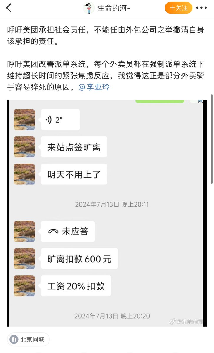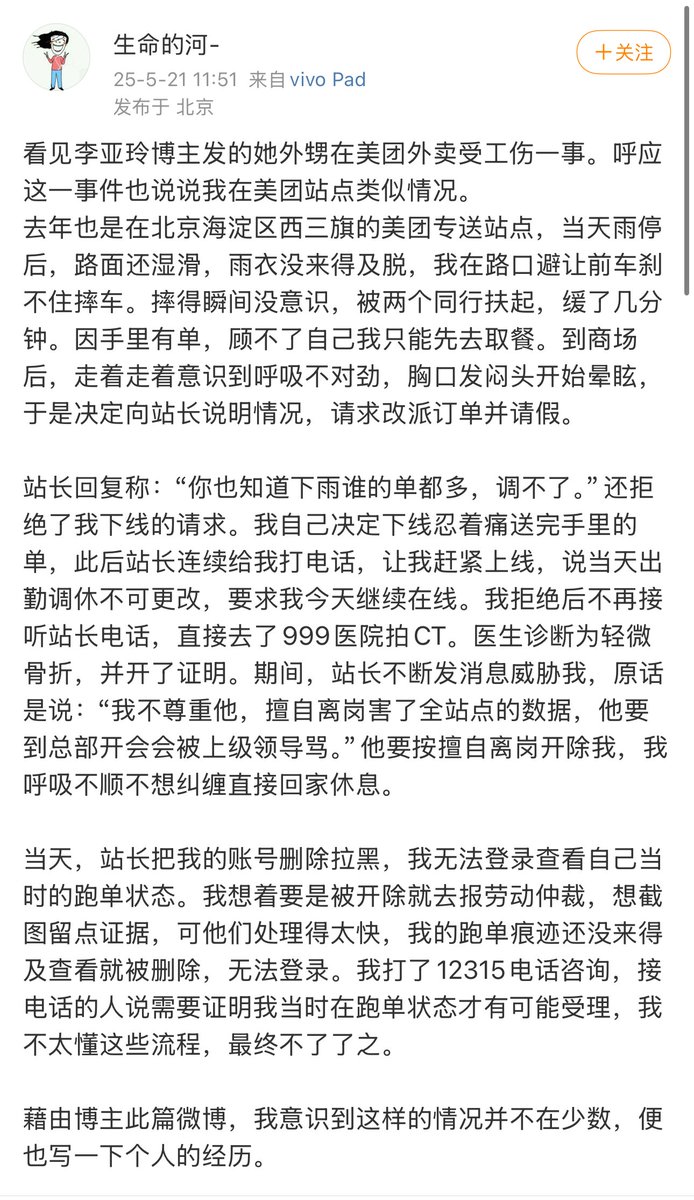 5月21日,北京。一名网友称,去年在北京跑美团专送,有天因雨后路面湿滑,自己在避让前车时摔车,随即失去意识,后去医院被诊断出轻微骨折,然而站长在得知他私自下线去医院看病后,单方面开除并删除了他的账号,导致他无法再继续跑美团专送。
