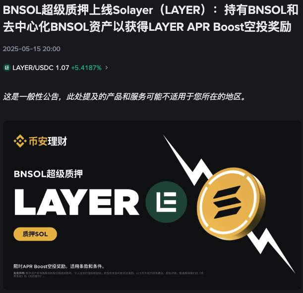 看到币安上了个活动,质押 Sol 可以获得APR的同时还能拿到 $Layer 的空投。我从链上搬了一些SOL回去放进去支持了。