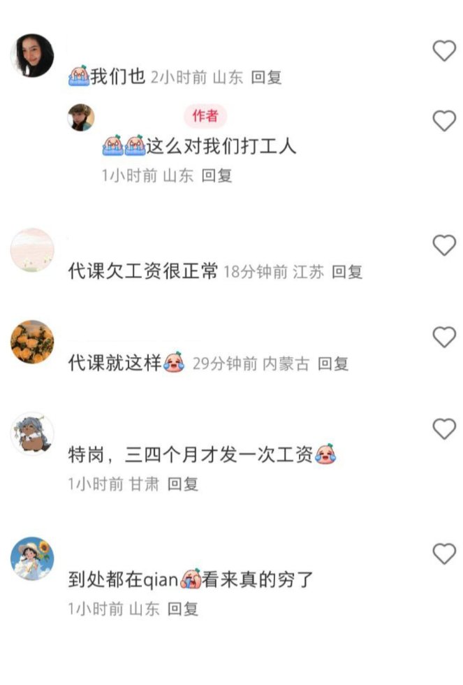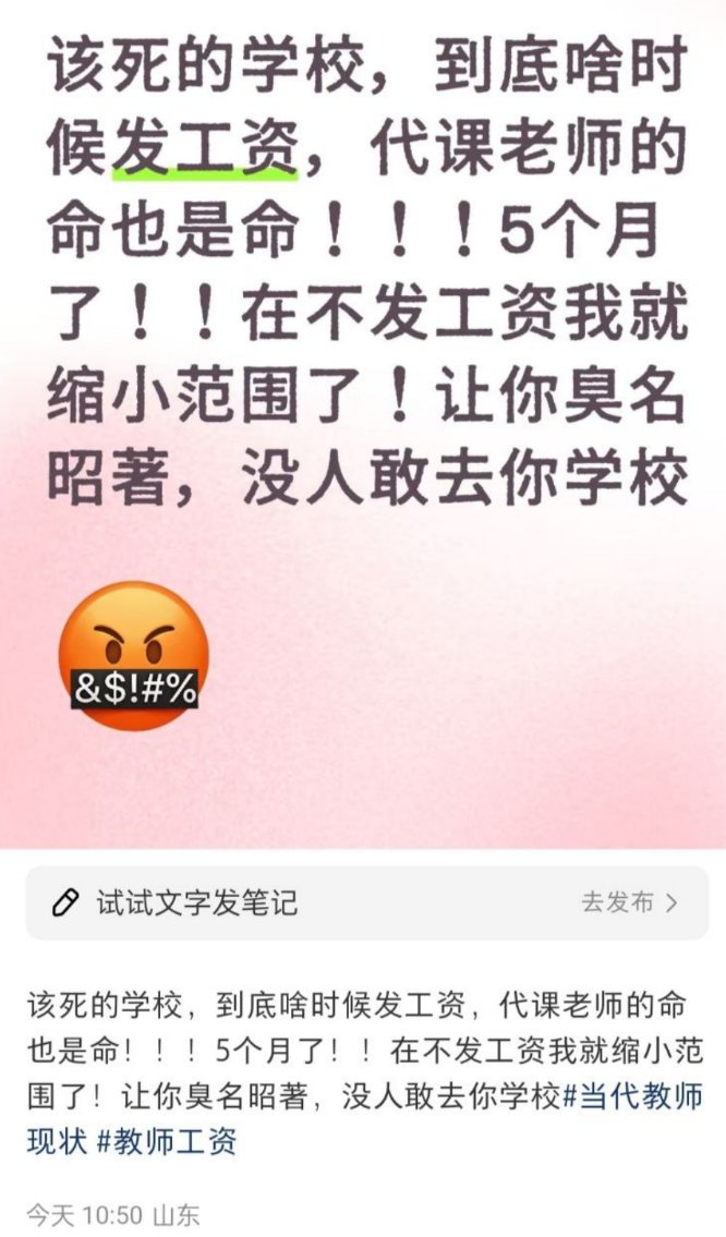 5月25日,山东,一博主发文表示代课老师已经被拖欠五个月工资了。有网友跟帖表示,我今天发了一条欠我工资的小红书,没半个小时,局里就给校长打电话,校长给我打电话让我删了而且我离职了还是欠的22年的工资。还有一名甘肃的网友表示,特岗,三四个月才发一次工资。