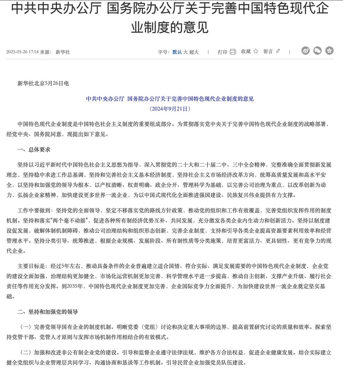 5月26日 中共中央办公厅印发《关于完善中国特色现代企业制度的意见》。其中除习近平思想再次指导改革以外,还提到要加强和改进非公有制企业党的建设。 “结合实际建立健全党组织与企业管理层沟通协商和恳谈等工作机制。引导民营企业加强党员队伍建设。” 该文件还提出了19条意见,推动在5年内建立中国特色现代企业制度。