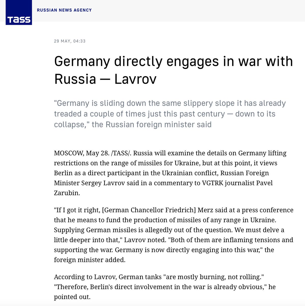 5月28日 俄罗斯外交部长威胁德国称:德国正在走上曾经导致其毁灭的道路。 而此前德国新任总理刚刚批准乌克兰使用远程导弹直接攻击俄罗斯本土,德国将不再对提供给乌克兰的导弹施加任何射程限制,并将和乌克兰联合生产远程武器,还将额外提供50亿欧元军事援助。 俄罗斯外交部长谢尔盖表示,德国的计划表明其已是俄乌战争的直接参与者,德国正在走上过去百年间曾导致其毁灭的道路。 同时他还嘲讽德国坦克“大多在燃烧,而不是在运转。”