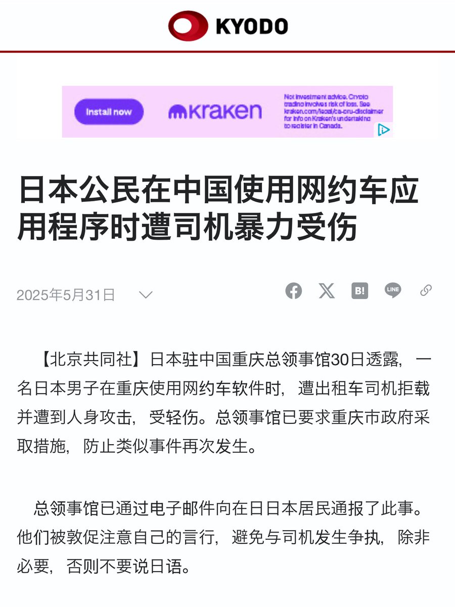 共同社报道一日本国民,在重庆使用网约车软件时,遭到了人身攻击日本领事馆告诫日本公民,非必要尽量不要在中国说日语