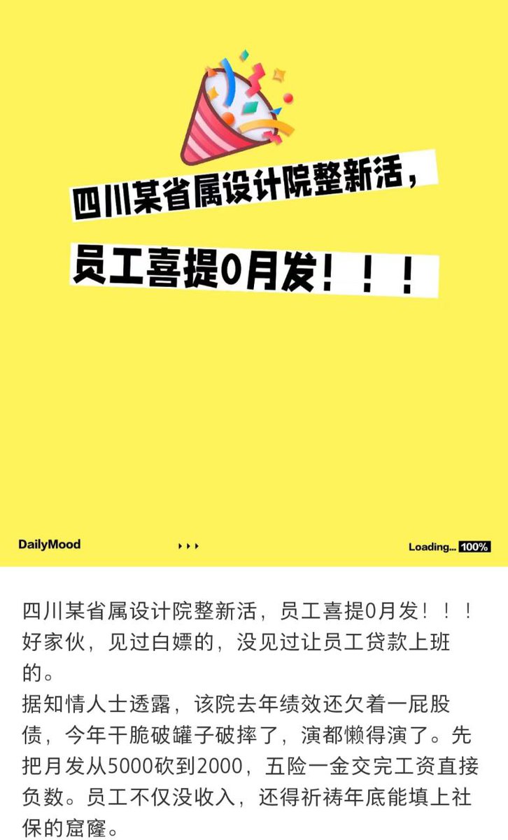 6月1日 一博主吐槽四川某省属设计院员工喜提0月发!见过白嫖的,没见过让员工贷款上班的。该院去年绩效还欠着,今年先把月发从5000砍到2000,五险一金交完工资直接负数。不仅没收入,还得祈祷年底能填上社保窟隆。就算面对这种情况,最离谱的还是没人跑路,都在苦苦蹲守,设计院打工人被驯化的太彻底