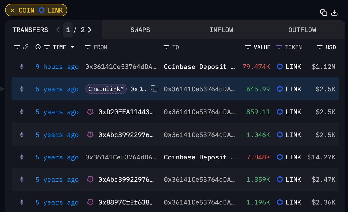 沉睡五年的 Chainlink 关联地址 9 小时前向 #Coinbase 充值 79474 枚 $LINK ,约 112 万美元,若卖出回报率高达 1958%!😲这部分代币在 2018.10-2020.02 期间从多个地址收到,当时成本仅 $0.6865(充值价格 $14.13),若本次卖出将获利 106 万美元钱包地址本文由 #Gate