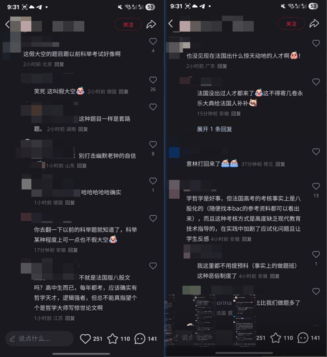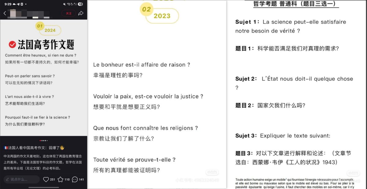 有人对比了中国高考和法国高考的作文题目,可以看到,法国高考的题目涉及科学哲学、政治哲学、认识论、文艺理论等深度哲学议题。例如,“想要和平就是想要正义吗?”、“艺术家是其作品的主宰吗?”……博主称赞法国高考的思辨性。不过有很多网友不以为然,嘲讽道:“也没见法国出什么惊天动地的人才“、”讨