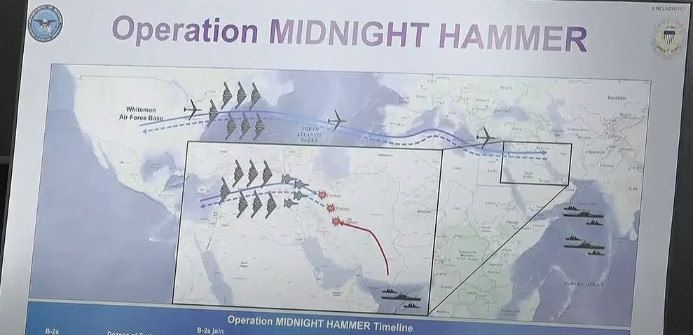 6架B2从美国本土起飞,横跨大西洋,穿越地中海,与以色列空军汇合,分三组直奔伊朗三处核试验场投弹,完成使命后返回。位于北印度洋的美航母编队疑似发射了战斧配合作战。美国的牛逼之处在于,不管多远,都可以把炸弹悄无声息地送到独裁者头顶。全球躲在地堡里的独裁者们瑟瑟发抖,下令再往下挖100米。