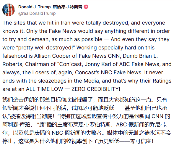 刚刚,特朗普在真相社交平台上发文强调,伊朗受攻击的核设施已经被”彻底摧毁“。同时,他还表达了对发布“假新闻”的媒体的不满。