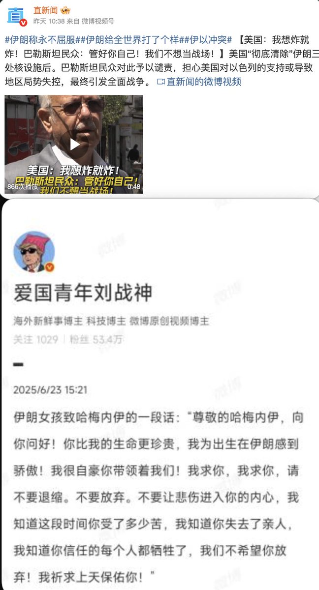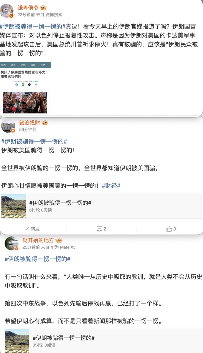 随着伊朗反击美以,到宣布停火,墙内的微博热搜从 “伊朗给全世界打了个样” 逐渐变成了 “伊朗被骗的一愣一愣的”
