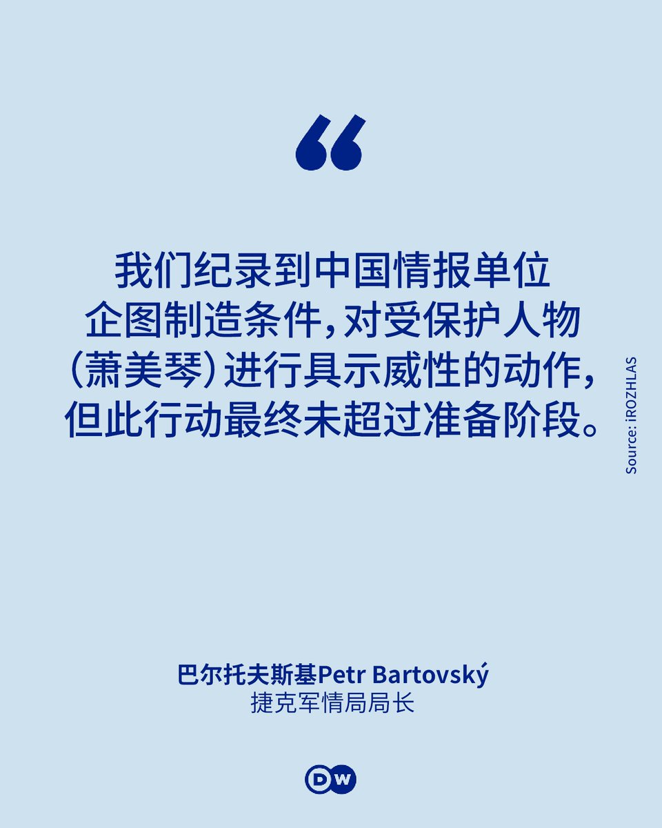 捷克军情局局长巴尔托夫斯基(Petr Bartovský)透露,北京目的是要借此吓阻萧美琴,“我们发现中国情报单位企图制造条件,对受保护人物(萧美琴)进行具示威性的举动”。