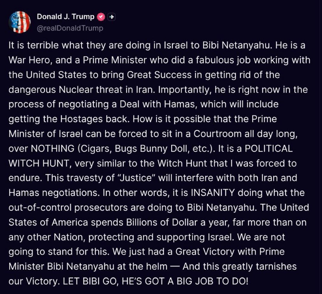 川普刚刚说:“他们对以色列比比·内塔尼亚胡(Bibi