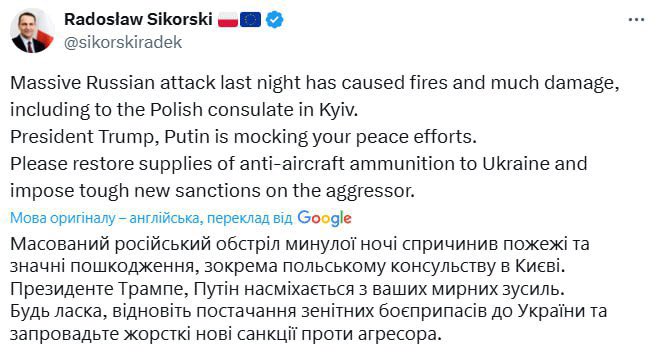 波蘭領事館在俄羅斯對的基輔大規模襲擊中受損外交部長拉多斯瓦夫·西科爾斯基 他和共和黨人唐·培根一樣,表示普京是在嘲笑特朗普,並呼籲他恢復向烏克蘭供應防空彈藥,並實施嚴厲制裁。