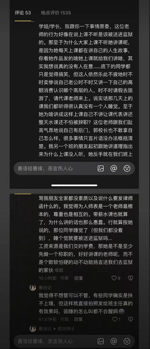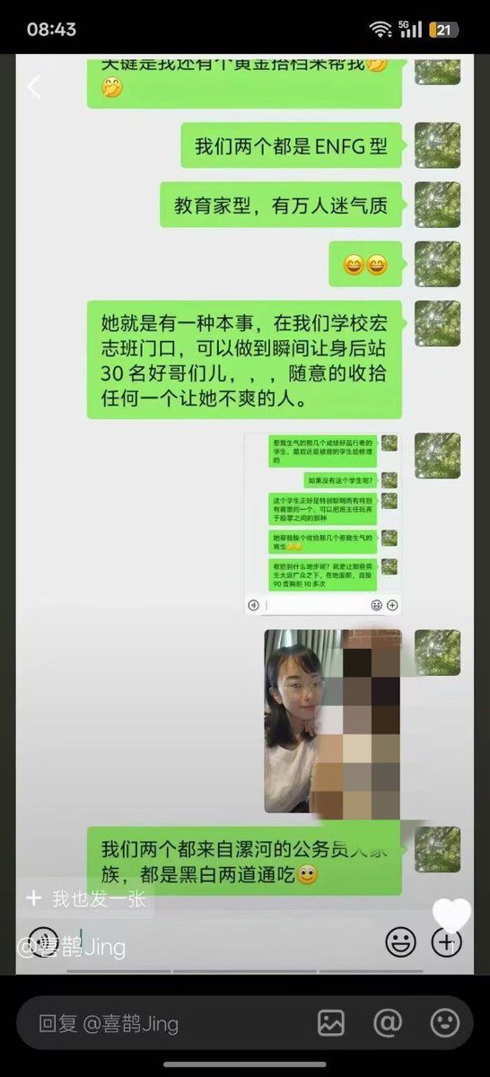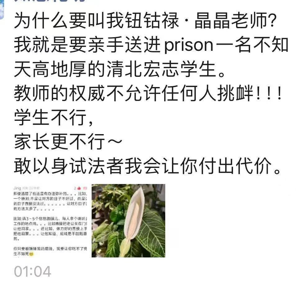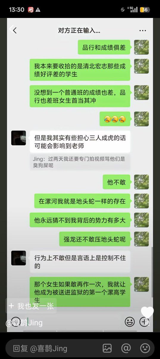 网友曝光,漯河高级中学英语老师吕晶晶,自称是漯河的地头蛇,黑白两道通吃,并扬言“要把学生送进监狱”,“7月10号后一个一个收拾”。据学生描述,这位老师很喜欢讲自己的人生故事,经常炫耀自己有钱有人脉,经常请假出去旅游让别人代课,扬言自己有人脉,校长不敢拿自己怎么样……