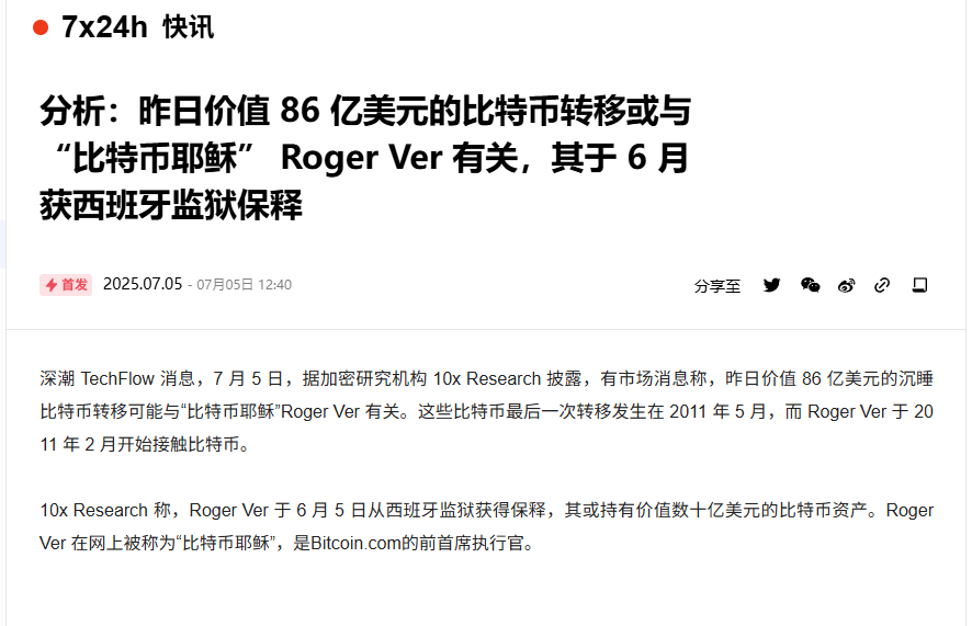 近期有消息称,价值86亿美元的比特币(约80万枚)在2025年6月被转移,市场猜测与Roger Ver有关: