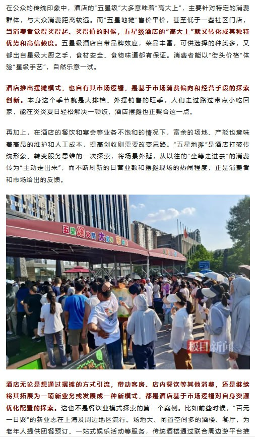 《光明日报》称赞五星级酒店在“禁酒令”下出来摆摊:五星级酒店出来摆摊是打破传统形象,转变服务思维,符合市场逻辑,体现“亲民”姿态,服务大众消费的好事。尽显人间烟火气。“不断刷新的日营业额和摆摊现场的热闹程度,正是消费者和市场给出的反馈。”