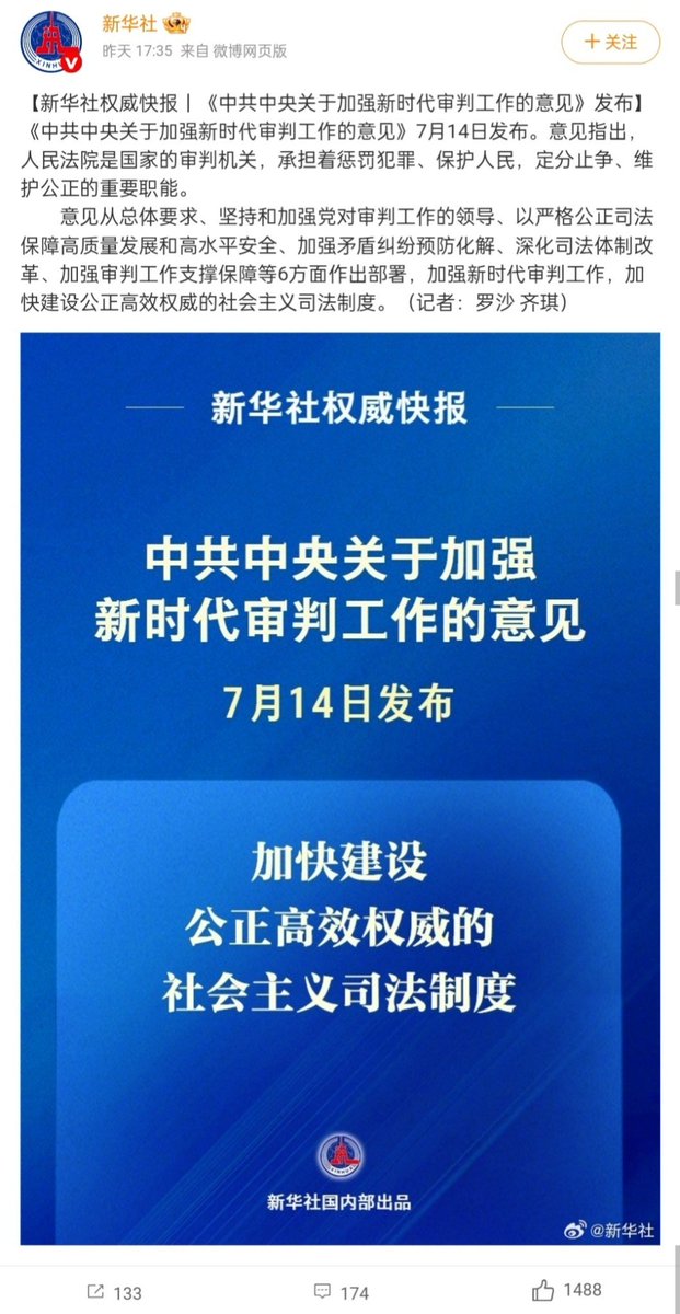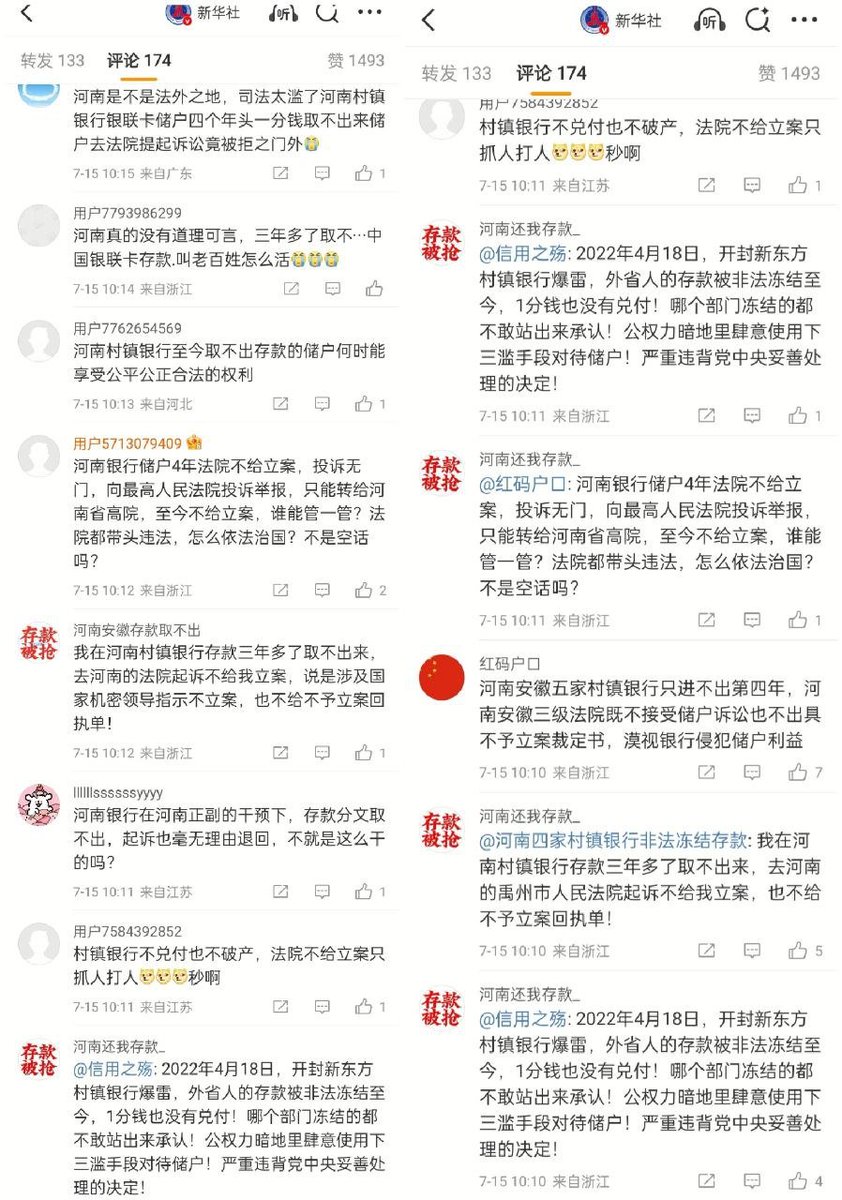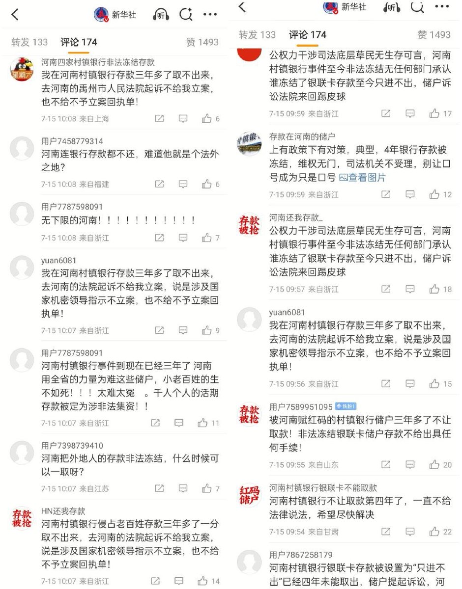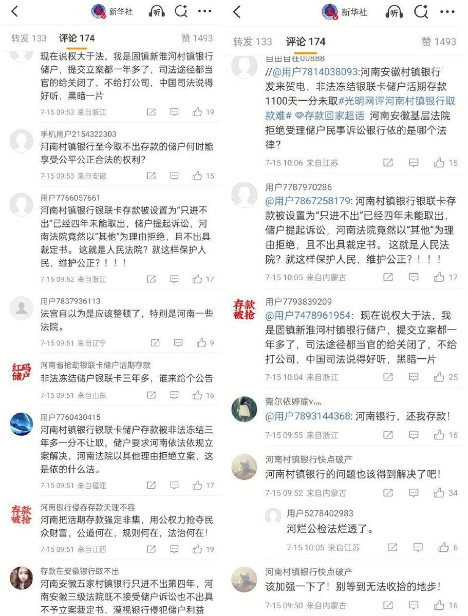7月14日,新华社报道《中共中央关于加强新时代审判工作的意见》,强调加快建设公正高效权威的社会主义司法制度。评论区涌入大量河南安徽村镇银行储户喊冤。