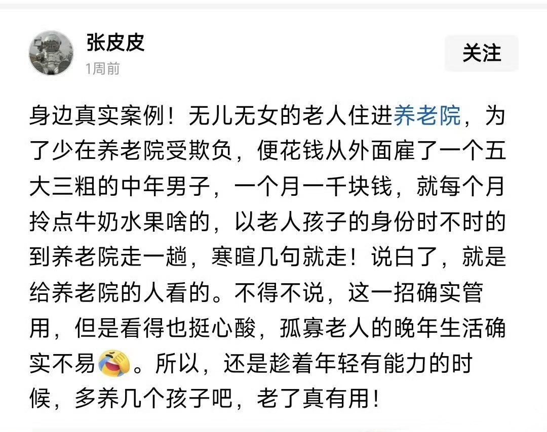 这个故事告诉我们,不用花钱养孩子,老了只需要每个月花一千,就不会被人欺负了😌
