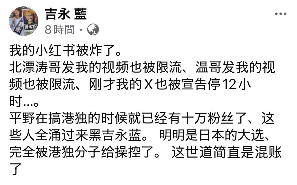 1, 弃子,吉永蓝高调宣布参与选举,调性很合中共口味,但其分裂作法引发争议,加之其疯狂辱骂批评者的举动,这可不是中共想要的棋子调性,所以弃之如敝履。