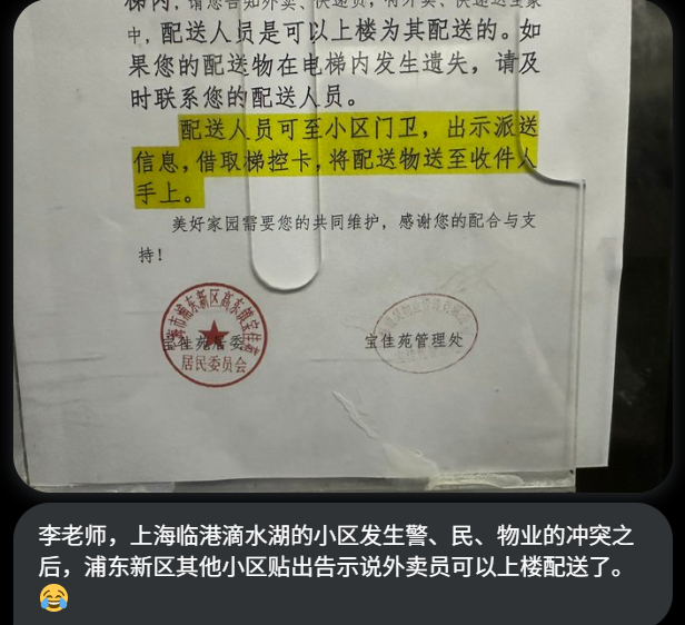 网友补充后续上海滴水湖外卖员与物业冲突事件发生后目前浦东新区的其他小区开始贴出公告允许外卖员上楼了。