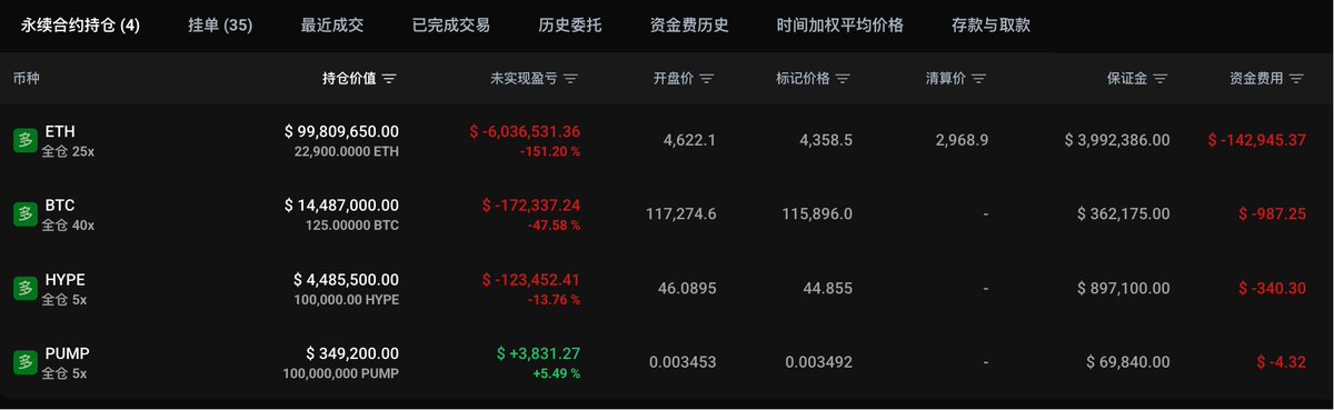 麻吉老哥的多单又被创飞了(主要是 ETH)因 $ETH 短时跌破 $4400,他的 25x 多单已浮亏 603.6 万美元,BTC 和 HYPE 累计浮亏 29.5 万美元,只有 PUMP 多单处于浮盈状态传送门 👉