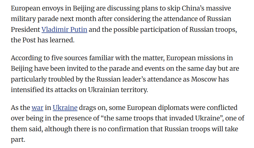 南华早报:考虑到俄罗斯总统普京将出席中国阅兵式以及俄罗斯军队可能参与阅兵的情况,欧洲驻北京特使正在讨论不参加中国9月3日举行的大规模阅兵式。