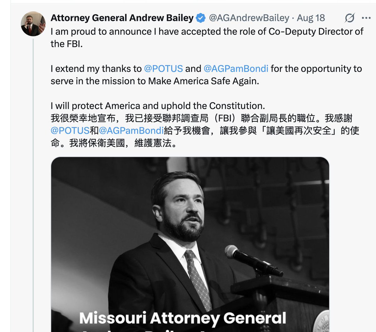 重磅新闻!曾因“中国病毒导致密苏里损失”起诉中国、并要求中国赔偿 240亿美元 的密苏里州检察长 ,还誓言要没收中国在密州的资产和农地。刚刚被川普任命为美国🇺🇸FBI联邦调查局副局长!