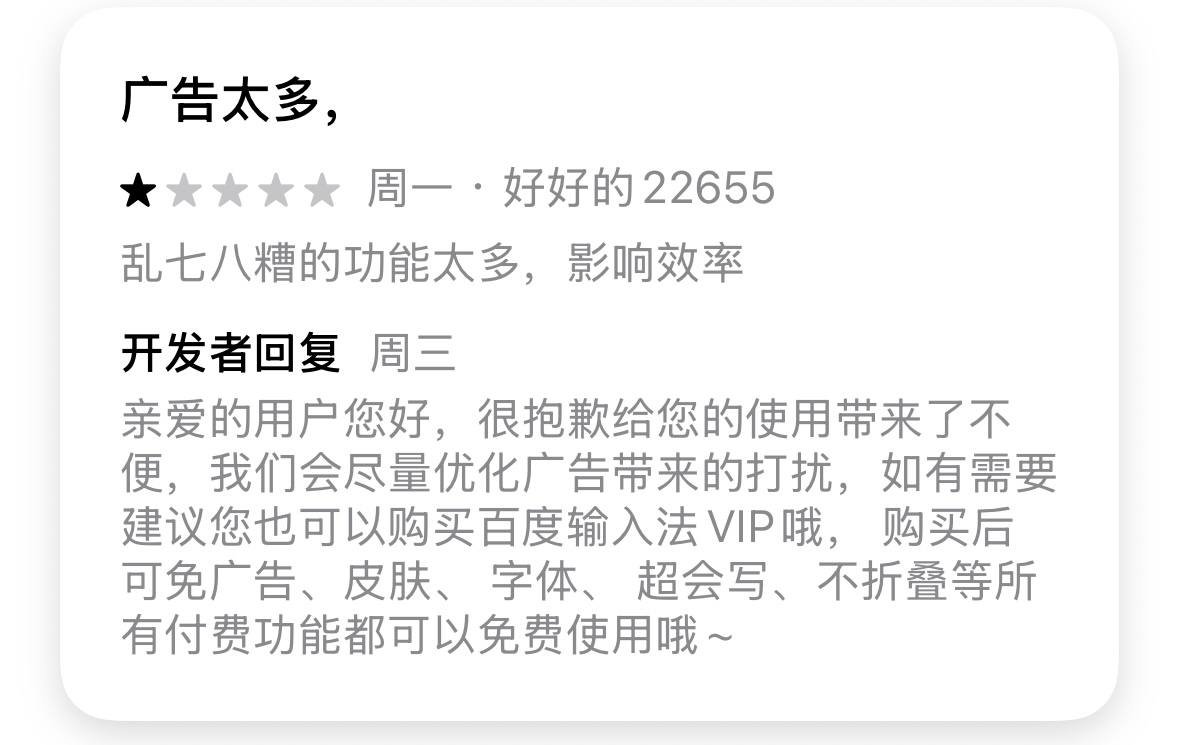 近日,网友在 App Store 里评价百度输入法广告多,开发者回应:购买百度输入法 vip 可免广告。