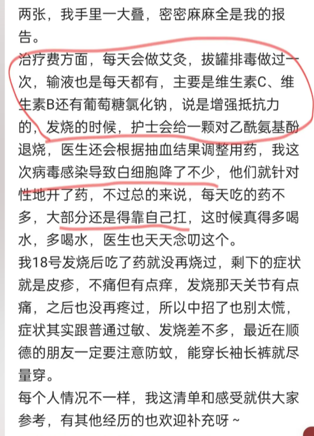 一位网友讲述自己的基孔肯亚热治疗经历:每天做艾灸和输液,做过一次拔罐。