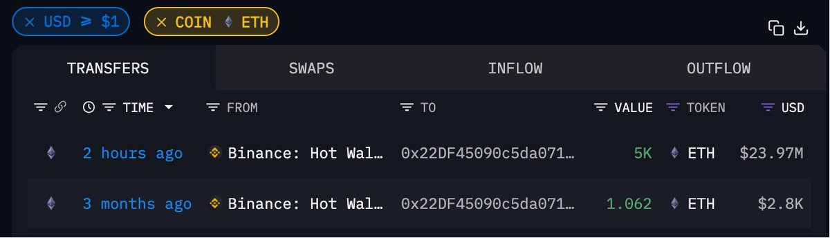 地址 0x22D...89028 在 2 小时前从 #Binance 提出 5000 枚 ETH,价值 2397 万美元有意思的是,这个地址在三个月前 ETH $2637 的时候曾小额提出 1.062 枚代币,却在此时 ETH 上涨后疑似建仓钱包地址本文由 #Gate 大门交易所 | 赞助