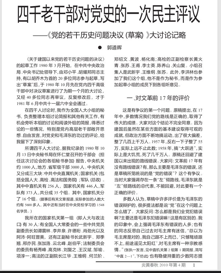 2010年《炎黃春秋》4月號,頭版頭條刊登法學界三老之一,朱鎔基清華時期入黨介紹人郭道暉的親歷記《四千老幹部對黨史的一次民主評議——黨的若干歷史問題決議(草案)〉大討論紀略》,當時作者身份是全國人大常委會法制工作委員會研究室副主任,是四千人會議中直機關第一組(全國人大、法治口)的秘書, 負責整理本組討論簡報和其他有關工作,有機會旁聽本組的討論和閱讀外組的簡報。