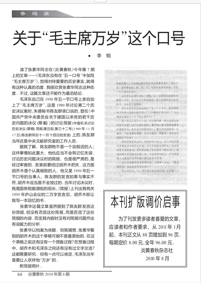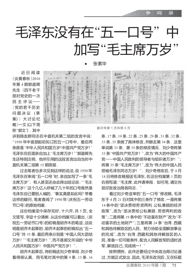 2010年《炎黃春秋》7月號,中共中央文獻研究室第一編研部副主任張素華發文《毛澤東沒有在“五一口號”中加寫“毛主席萬歲”》。