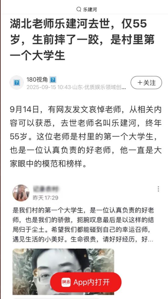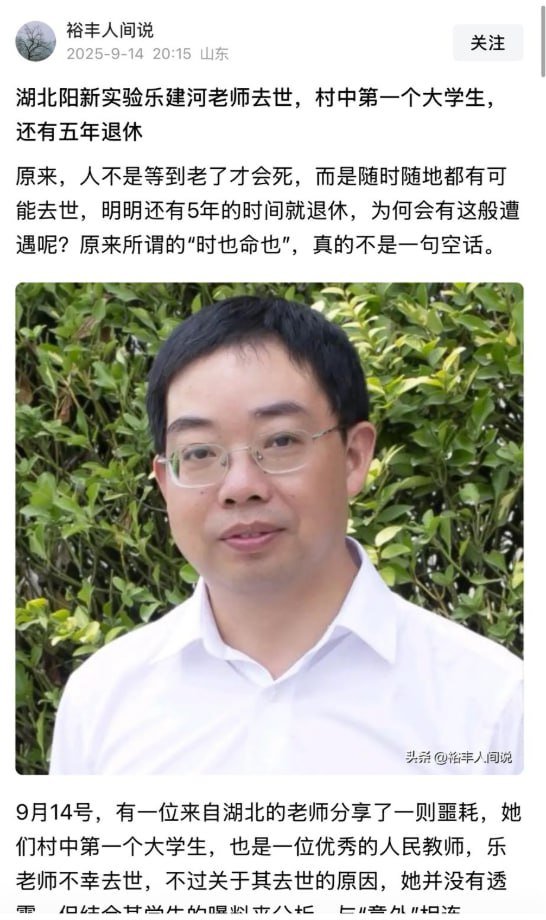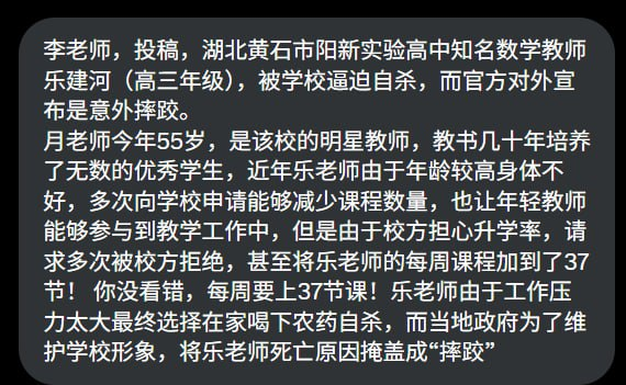 网友投稿:湖北黄石市阳新实验高中知名数学教师乐建河(高三年级),被学校逼迫自杀,而官方对外宣布是意外摔跤。近年乐老师由于年龄较高身体不好,多次申请减少课时未获批准,课时反增至每周37节。