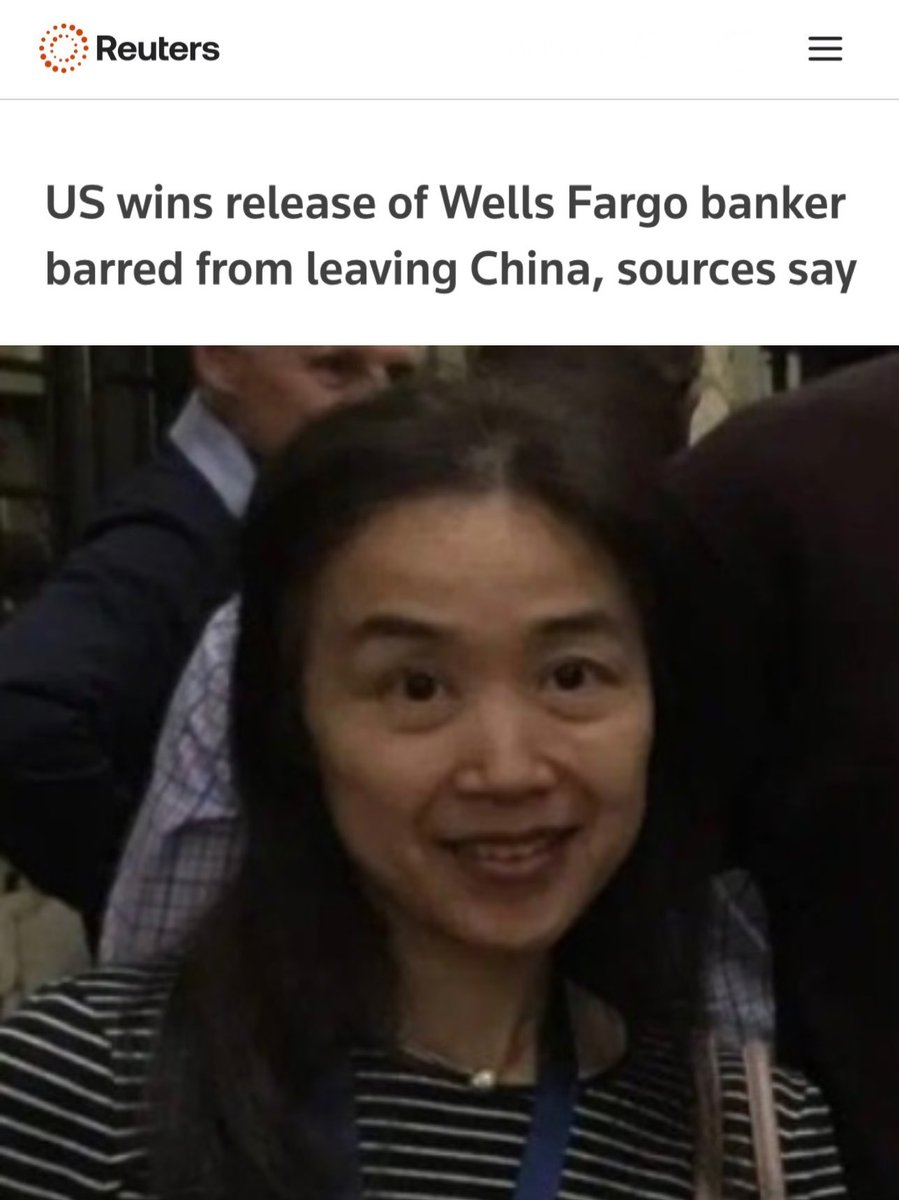 Wells Fargo banker Chenyue Mao (茅晨月), who had been barred from leaving China for several months, has been allowed to return to the US following negotiations between US and Chinese officials. Mao has already left China.
