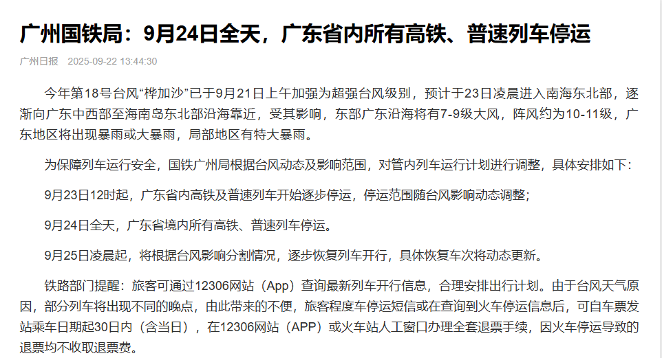 9月22日,据广州日报报道,受第18号台风“桦加沙”影响,9月24日全天,广东省内所有高铁、普速列车停运。