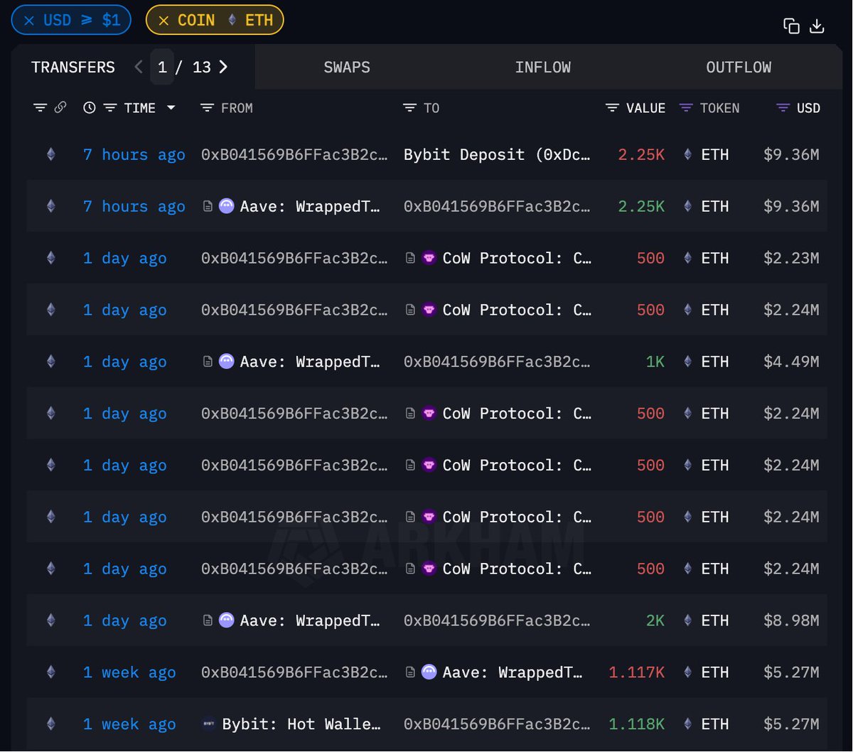 两周前均价 $4430 建仓 $ETH 的大户地址 0xB04...D6ECB 疑似割肉 2250 ETH,若卖出将亏损 60.7 万美元该地址在 09.10 - 09.13 期间从交易所提出 6915 枚 ETH,约 3063 万美元,7 小时前向 #Bybit 充值了其中 2250 枚(约 936 万美元),昨天还在链上以 $4385 抛售了 3000 枚目前地址仍持有 7554.7